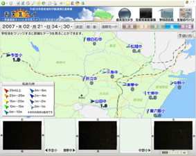 冬場の日中は、海岸に近い地域は暖かいのが一般的です。でも2007 年2 月22 日、朝から快晴 だったのですが13時40 分の気温を見ると海岸近くの七郷中が最低です(図3)。隣の中野小と東六郷小は市内最高です。これも風を見ると、七郷だけ強い海風が吹いています(図4)。この海風が寒かったのではないでしょうか。