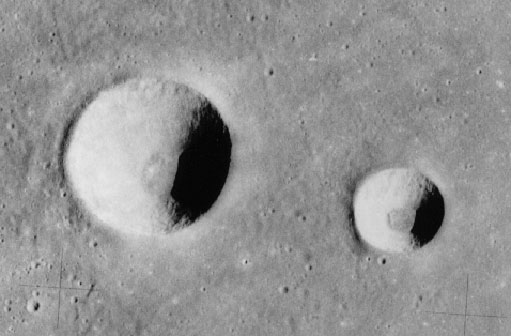 | The crater formed in sand from the impact of a 5cm diameter iron sphere dropped from a height of 2.5m The crater is 20cm across | An Apollo image of pair of craters on the lunar surface, in the Mare Crisium regionThe craters are 12km (left) and 5km (right) in diameter. |