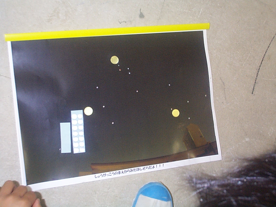 | いちばん明るい星を3つ見つけて金色のシールをはったところです。三角形になっているのがわかりますね。 これが夏の大三角です。 | 2番目に明るい星に銀色のシールをはって、その上から星座のプリントされたOHPシートをかぶせました。 はくちょうざ、ことざ、わしざ があるのが分かります。 |