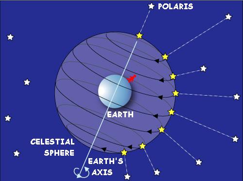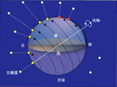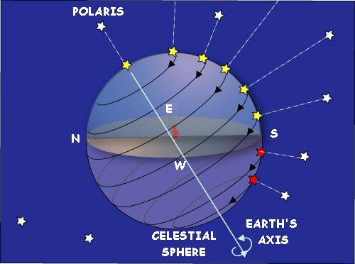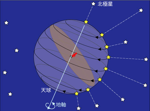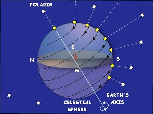 Because the Earth as shown above, rotates with the direction of the Polaris as an axis, the star with respect to the celestial sphere is visible as in the figure, as with respect to the celestial sphere been moving to the direction of opposite to the direction of rotation of the earth.
