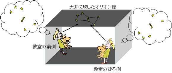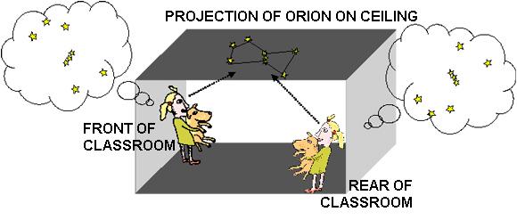 We can imagine the whole classroom to be the Earth, with the front half being the northern hemisphere, the rear half being the southern hemisphere, and the whole ceiling being the celestial sphere. When pupils look at the projected image of Orion on the ceiling, those at the rear of the class will see it upside down.