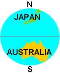 | Japan is in the northern hemisphere, while Australia is in the southern hemisphere. | Using the classroom to represent the earth, the front half is the northern hemisphere and the rear half is the southern hemisphere. |