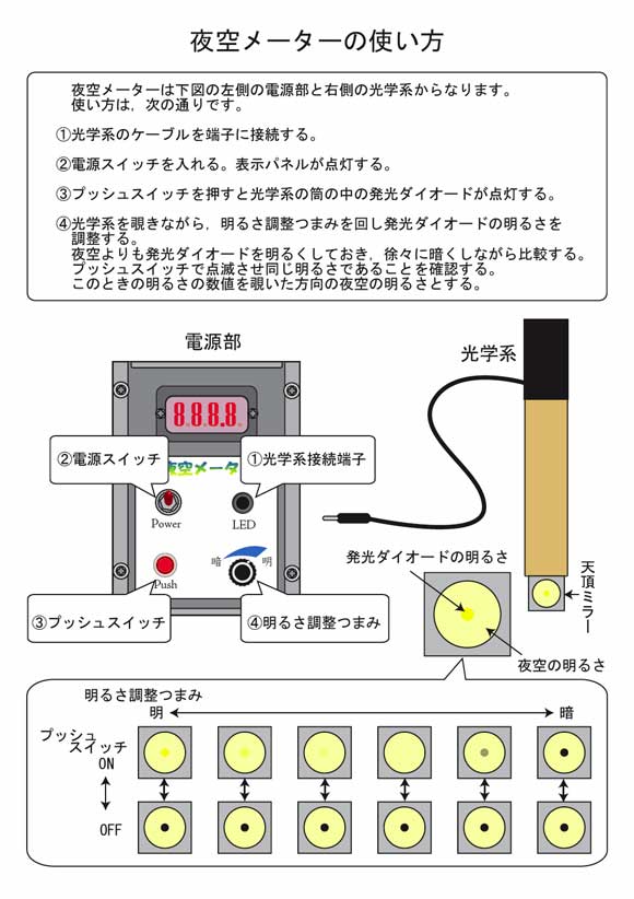 夜空メーターは夜空の明るさと夜空メーターの発光ダイオードの明るさを比較することで、夜空の明るさを数値で表すことができる装置です。この装置によって、多くの地点や方角、そして時間による夜空の明るさの違いを比較することができます。