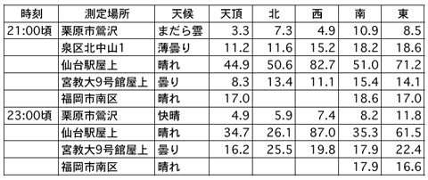 下の表は2005年に実施した夜空の明るさ協同観測結果の一部です。2005年9月28日の21:00および23:00の宮城県栗原市、仙台市泉区、仙台市青葉区仙台駅屋上、仙台市青葉区宮教大屋上、福岡市南区での観測結果を示しています。