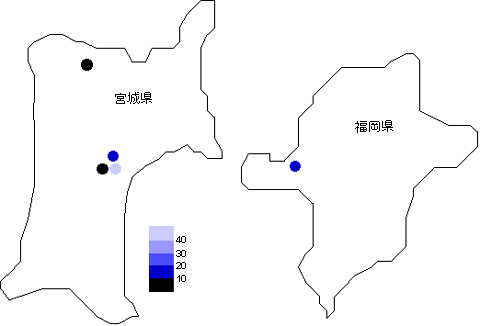 下の図は2005年9月28日21:00頃の測定値を数値によって色分けし、各測定場所にプロットしたものです。