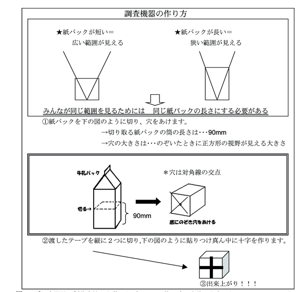 この教材では、牛乳パックを使ってつくる調査器具を用いて夜空を眺め,視野内に見える星の数を調べます。 その結果から観察地点で見える星の等級を知り,観察地域における星の見えやすさ(星空環境)について考えます。