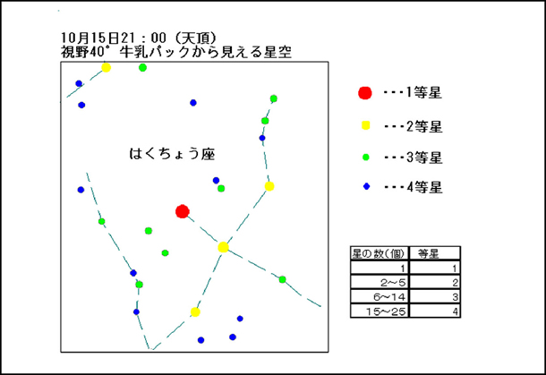 例えば、デネブ(下の図の●)を基準星とする視野40°の天頂の星空を表す図から等級ごとに見えるであろう星の数を数えて変換表を作ると下のようになります。