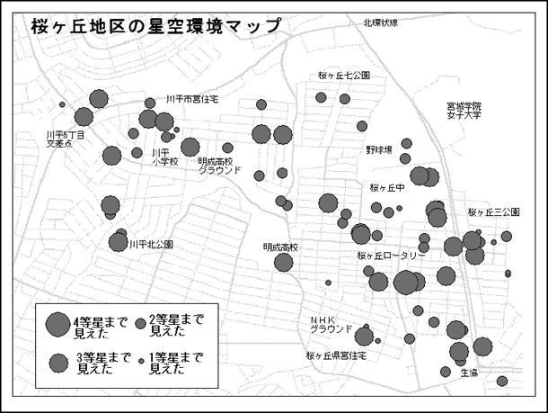 調査結果をまとめて地図にプロットします。 各観察地点について何等級まで見えたのか、「4等級まで見えた」「3等級まで見えた」「2等級まで見えた」「1等級まで見えた」とそれぞれ印を変えて地図に入れていきましょう。