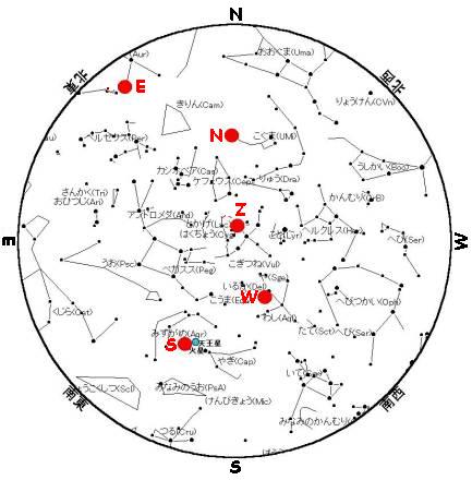 ●で示された星をそれぞれの方角で視野中心とする。北●北極星 東●カペラ 南●火星 西●アルタイル 天頂●デネブ。