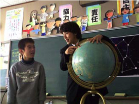 本実践授業では、オーストラリアからの星の見え方について、プロジェクターやパソコン、PCカメラ、地球儀を用いた教材(星座の見え方その1、星座の見え方その2 参照)を使って理解することを目的とした。