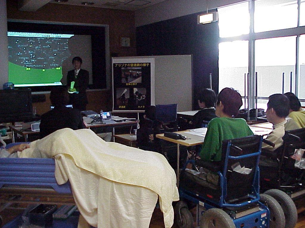 | アリゾナの望遠鏡についての説明を聞く | 「海外にある望遠鏡を、目の前にあるパソコンを用い、インターネット経由で遠隔操作すること」を伝え、 A0サイズパネル とpower pointスライドショーを用いてアリゾナの場所、現地の様子、現地と日本との時差(16時間)、 望遠鏡の設置状況について詳しく説明する。 |
